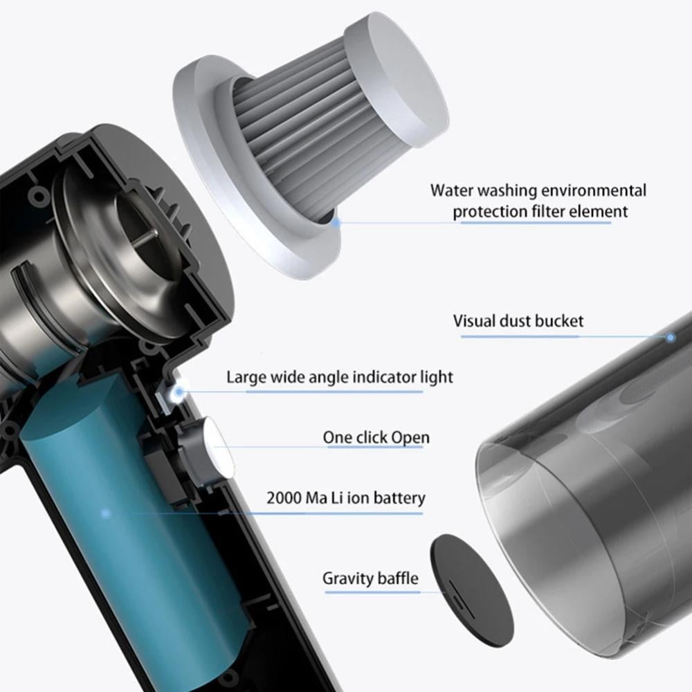 • مكنسة سيارة كهربائية محمولة مصممة بقوة شفط عالية تصل إلى 6000Pa تزيل الأتربة والأوساخ بفعالية داخل السيارة